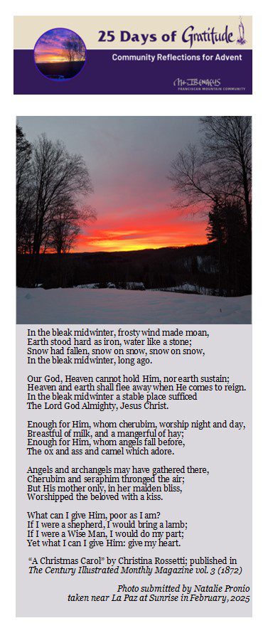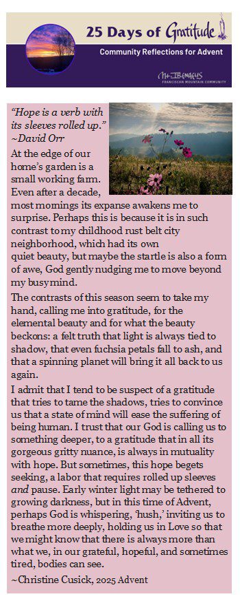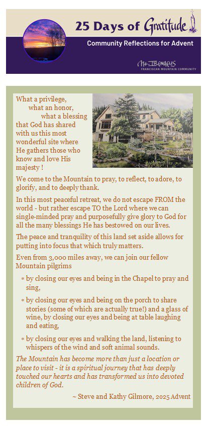 Along the way, feel free to let us know if you are enjoying this initiative, any suggestions to improve, and if you’d like to participate with your own reflections in the future. Feedback can be sent to peace@mountainonline.org.