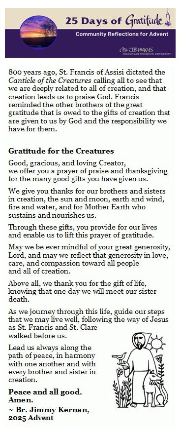 We are so happy to share this new initiative with you! Our good friend Mary Freeman, who’s part of our “Weekends and More” branch of our Council for Spirit and Life, came up with the idea that we share “expressions of gratitude” during the season of Advent.