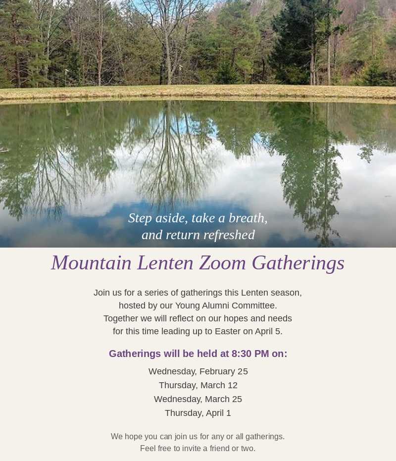 This year, our Mountain Lenten Zoom Gatherings will take place at 8:30 on each of the following dates: