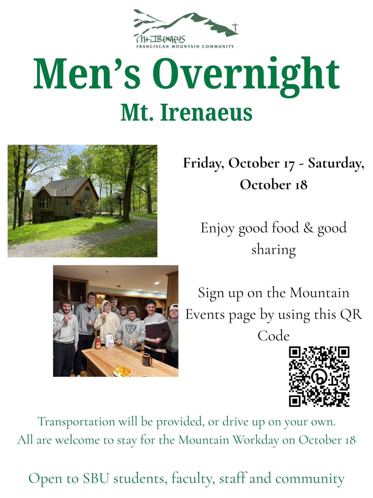 Join us October 17 at Mt. Irenaeus for the Men’s Overnight – vans leave Café La Verna at 4:00 pm on Friday, October 17, and will return to campus around 8 am on October 18 if you can’t join us for the workday or 4 pm if you can stay. If you’re driving yourself, please don’t use GPS, follow the directions you will find HERE on our website.