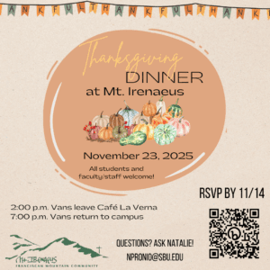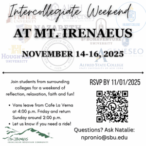 Are you a college student? We'd like to invite you to our annual Fall Intercollegiate Retreat at Mt. Irenaeus! We are very excited to host you and other young adults from area colleges and universities for a weekend of reflection, relaxation, fellowship, faith and fun! Our Intercollegiate Retreat will run the weekend of Nov 14-16. Participants are asked to arrive by 5:30 p.m. on Friday and stay until after brunch on Sunday, at approximately 2 p.m. Ready to commit to a…