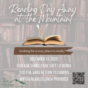 Are you looking for a quiet place to study for finals? Where can be more ideal than the Mountain? With our fiber-optic internet, we can provide you a quiet place to study, get papers written or do work. Need a break from studying? Take a short walk or hike to clear your head. Need to say a prayer for a class that has you totally stressed out? The Chapel is the right place for calm, meditation and prayer. Vans will…