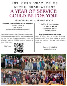 Are you weighing the idea of doing a year (or more) of volunteer service after graduation? Would meeting some other young people currently doing the same help your decision? Meet, eat, reflect and pray with members of the Franciscan Volunteer Ministry (FVM) on Tuesday, March 10. Franciscan Volunteer Ministers "live in community and live a life of simplicity, expressed prayer and ministry." Currently FVMs serve in Philadelphia, PA and Durham, NC. Transportation leaves Café LaVerna at 4 pm and return…