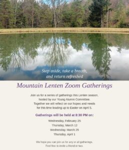 Step aside, take a breath return refreshed! Join us for a series of Zoom Gatherings this Lenten season hosted by our Young Alumni Committee. We will discuss our hopes and needs for this time leading up to Easter on April 5. This year, our Mountain Lenten Zoom Gatherings will take place at 8:30 on each of the following dates: Thursday, Mar 12 Wednesday, Mar 25 Wednesday, April 1 We hope you will be able to join us for any (or…